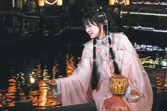Посетител, облечен в традиционно облекло, се наслаждава на нощния живот в Кайфенг, Хенан. LI ZONGXIAN/ЗА КИТАЙ ДАЙЛИ
