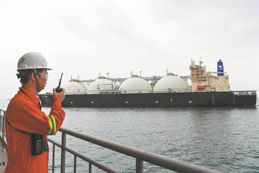 Служител ръководи превозвач на втечнен природен газ, пристигащ в приемна станция в Шенжен, провинция Гуангдонг, на 7 септември. [Photo/XINHUA]