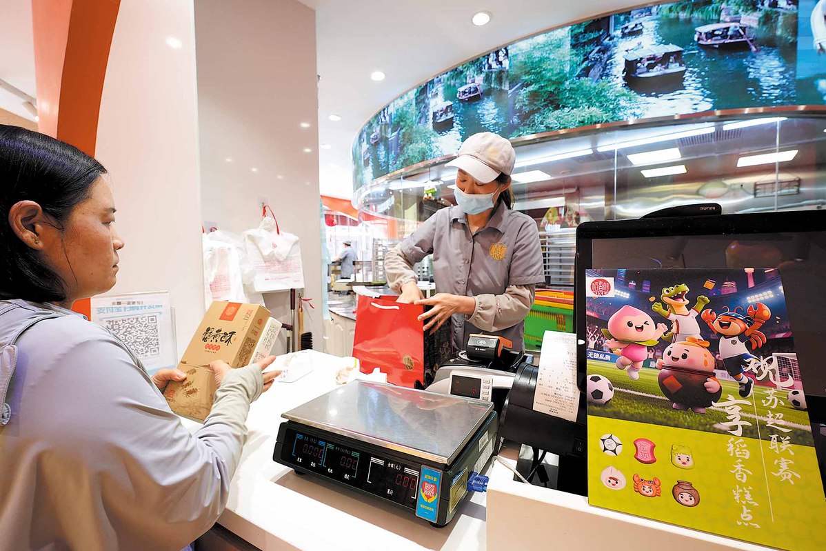 Почитаната от времето пекинска марка за закуски Daoxiangcun в Суджоу, провинция Дзянсу, предлага сладкиши в стил Суджоу, за да привлече клиенти на 29 юни. CHINA DAILY