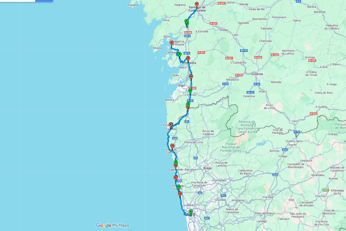This is a Google Maps track of a Camino Portuguese route combining the Litoral, Coastal, Central routes, and the Spiritual Way. This Google maps trail can be used on a mobile phone for navigation. We created this map following the yellow arrows with a GPS device. The link can only be opened while online (with Wi-Fi or data), but navigation on the track works even when offline. Click on the map, make it full screen, zoom in and keep the blue dot on the trail.